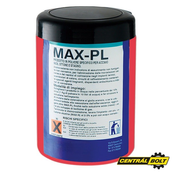 Koncentrált, nagyhatású vízkőoldó por rozsdamentes acél, réz és ón felületek tisztítására. A por tartalmaz egy speciális pH indikátort, melynek színe megváltozik pirosról sárgára, narancssárgára, ha az aktív folyadék elveszíti hatását. MAX PL utántöltésével ismét aktívvá tehetjük az oldatot. Savas kémhatású oldat, mely tartalmaz habzásgátló, korrózióvédő összetevőt, mely megvédi a rendszer fémes felületeit. 10-15%-os arányban kell hígítani vízben.